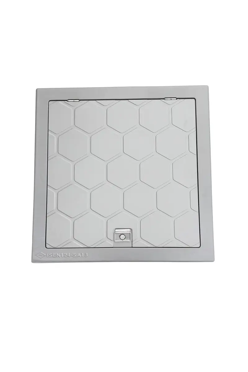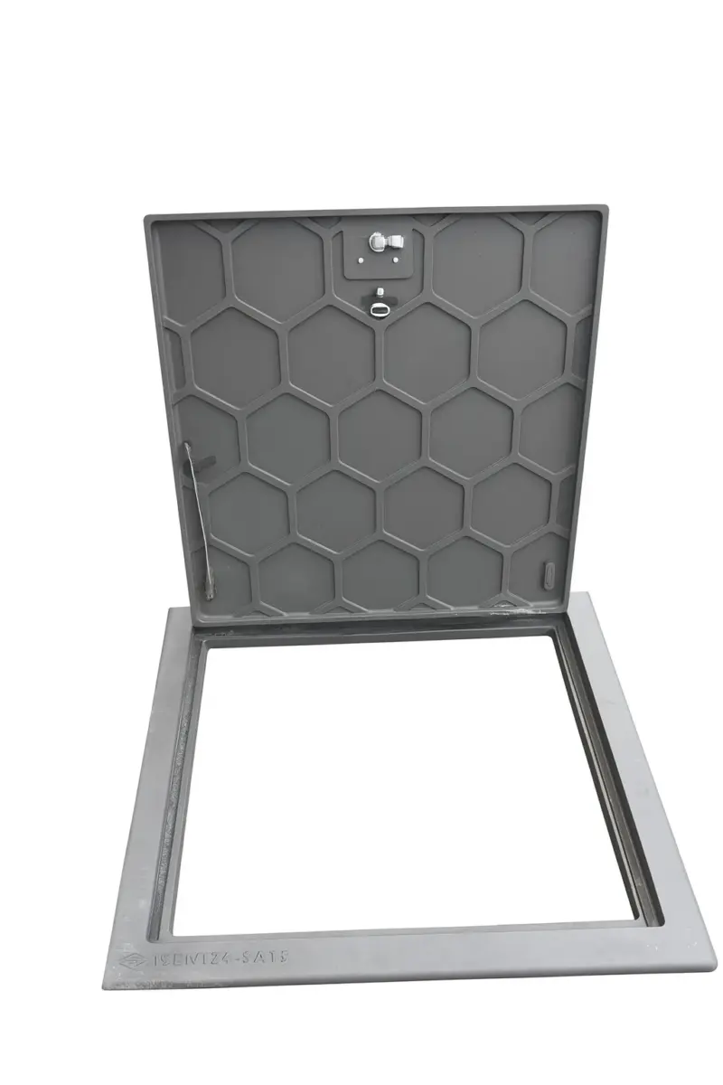 Il coperchio è dotato di un pratico sistema di apertura con perno metallico e predisposizione per chiusura, ideale per proteggere il vano tecnico da accessi indesiderati e dagli agenti atmosferici. Il telaio robusto permette l’installazione a filo pavimento, garantendo un risultato pulito e professionale intorno alla piscina.